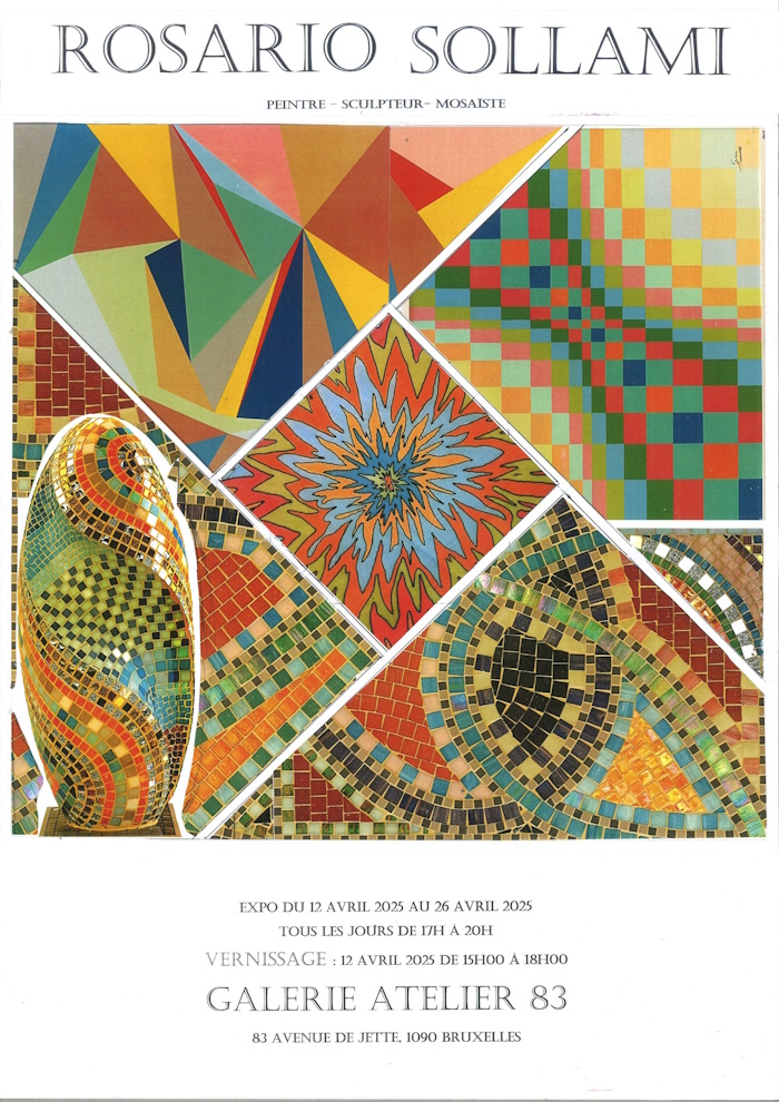 Rosario Sollami, né en 1947, est un artiste complet et profondément inspiré. Poète, peintre, sculpteur et mosaïste, il est originaire d’Anderlecht, mais son âme est profondément ancrée dans la lumière et la mémoire de ses racines siciliennes. Arrivé à Bruxelles il y a plus d’un demi-siècle, il a d’abord exercé comme dessinateur, avant de se tourner vers la peinture et la tapisserie, tout en poursuivant une formation à l’Université ouvrière du Centre d’Action Sociale Italien. Ce chemin, à la fois artistique et intellectuel, témoigne de son engagement constant dans une démarche d’exploration et de transmission.
